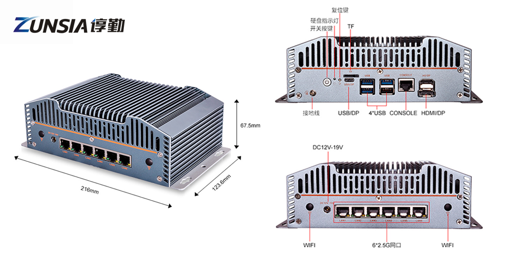 顯示方麵有HDMI2.0、DP、Type-C(USB3.0+DP);帶有豐富的外接接口, 6網口、TPM2.0、M-Key 2280 SSD、STAT3.0、RS232、USB2/3.0等;滿足與其他外接控製器、工業攝像頭、稱重傳感器等設備的互聯;DC12-19V的電源供電,支持Windows和Linux操作係統,可在-20℃至+60℃工作,鋁合金的外殼讓其有良好的散熱以及防塵抗擾的能力。